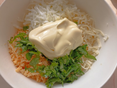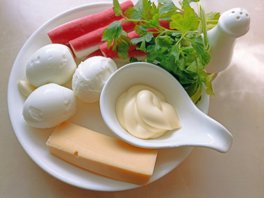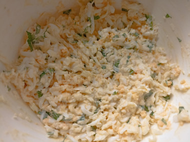 Чеснок очистите, ополосните и пропустите через пресс или мелко порубите ножом. Также мелко нарежьте зелень петрушки. В салатнике соедините тертые белки, треть тертых желтков, сыр, чеснок и петрушку. Заправьте майонезом. Поперчите по вкусу и перемешайте.Шаг 5. Как развернуть крабовые палочки?