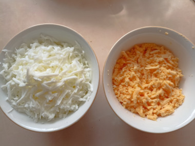 Яйца вымойте и сварите вкрутую. Для этого положите их в кастрюлю, залейте холодной водой и поставьте на средний огонь. Немного присолите воду, благодаря этому скорлупа сохранит целостность. Варите яйца примерно минут 9-10 после закипания воды. Готовые яйца залейте холодной водой. От резкого перепада температуры скорлупа лучше очистится. Отделите белки от желтков и натрите их по отдельности на средней терке. Подробнее о выборе яиц читайте под шагами.Шаг 3. Как натереть сыр?