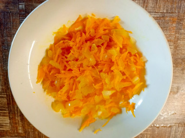 Пока варится бульон, займитесь овощами. Очистите лук, морковь и картофель. Нарежьте лук мелким кубиком, натрите морковь на крупной терке. Разогрейте сковороду с растительным маслом и и обжарьте лук. Когда он станет прозрачным, добавьте морковь. Жарьте овощи до золотистого цвета и мягкости. Периодически помешивайте, чтобы овощи не пригорели, слишком зажаренными они не очень хорошо выглядят в готовом супе.