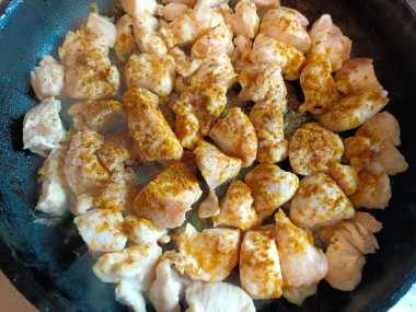 На сковороде разогрейте подсолнечное масло. Обжарьте курицу на высоком огне до образования золотистой корочки. Добавьте карри и любые другие приправы на ваше усмотрение. Посолите по вкусу. Перемешайте. Как подобрать сковороду и масло для жарки читайте в статьях на эти темы. Ссылки в конце рецепта.
