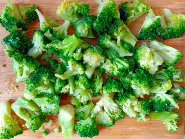 Чуть разморозьте брокколи. Слишком крупные соцветия разрежьте ножом, делая их более-менее плоскими. Мелкие соцветия можно оставить целыми.