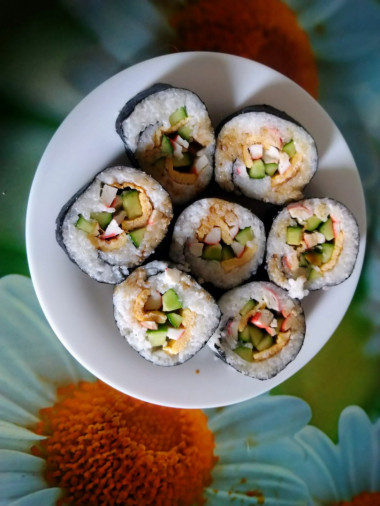 Делала на днях роллы, и у меня осталось два листа нори. Решила из них что-нибудь ещё приготовить. Нашла на сайте рецепт кимбап по-корейски.