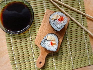 Кимбапы получились очень сытные и вкусные. Все ингредиенты в них отлично сочетаются друг с другом. С соевым соус и имбирем ещё вкуснее.