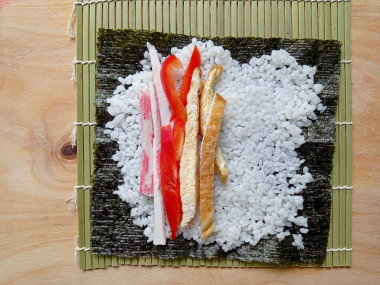 В этом рецепте я приготовила кимбап с крабовыми палочками, огурцами и омлетом. Вы также можете приготовить корейские роллы с такой начинкой: 1. маринованной в уксусе морковкой, запеченной курицей, огурцом и омлетом; 2. копчеными колбасками, маринованной морковью, болгарским перцем и омлетом. Вместо морковки можно добавлять маринованный дайкон. Есть еще много других вариантов.