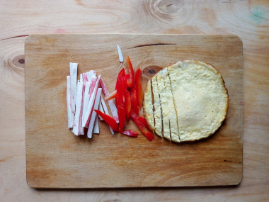 Пока омлет жарится, разрежьте крабовые палочки вдоль пополам и также разрежьте огурцы на полосочки. Готовый омлет тоже нарежьте на полоски шириной около 2 см.