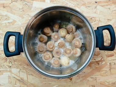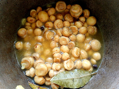 Подготовленные шампиньоны переложите в кастрюлю с маринадом. Как видно на фотографии, только первый ряд шампиньонов касается маринада, но не переживайте, при варке шампиньоны выделят свою влагу и уменьшатся в размерах. Таким образом, все грибочки хорошо проварятся в ароматном маринаде.