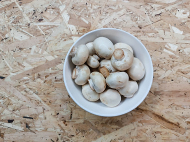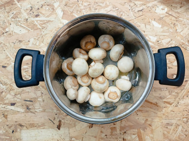 Следующим шагом необходимо подготовить к приготовлению непосредственно сами шампиньоны. Грибы быстрыми движениями промойте под проточной водой от песка и других загрязнений, по желанию для большей эстетики удалите так называемую «юбочку» под шляпкой. Если шампиньоны очень крупные, то на этом этапе их необходимо разрезать на части.