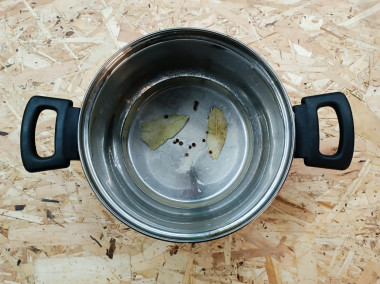 Первым шагом необходимо подготовить будущий маринад. Для этого в кастрюлю налейте воду и столовый 9% уксус, всыпьте соль и сахар, положите перец горошком, гвоздику и лавровый лист. Положите чеснок, предварительно нарезав его зубчики небольшими пластинками, и влейте растительное масло.