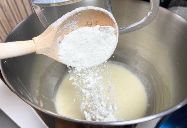 Чтобы замесить тесто, воспользуемся специальной насадкой для замешивания густого теста под названием «крюк». Для этого в емкость с яичной смесью нужно постепенно, небольшими порциями добавлять муку, просеянную через сито. Когда тесто полностью будет вымешено, выньте его из емкости и переложите на тарелку или рабочую поверхность, чтобы было удобно отщипывать от него небольшие кусочки. Допустимо замешивать тесто ложкой, а потом руками. Оно получается плотны