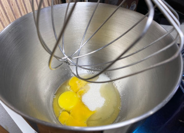 Яйца с сахаром взбейте миксером в течение нескольких минут так, чтобы довести их до состояния крепкой пены.
