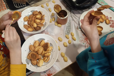 Теперь можно пользоваться либо мультипекарем с панелями для печенья «орешки», или простой советской орешницей (у кого она имеется). Процесс простой: отщипывайте от теста кусочки, скатывайте их в шарик и перекладывайте в форму. Заполните так все ячейки мультипекаря или орешницы. Затем накройте нижнюю часть формы верхней и пеките печеньки в течение 3-4 минут. Готовые орешки переложите на деревянную поверхность и остужайте при комнатной температуре.