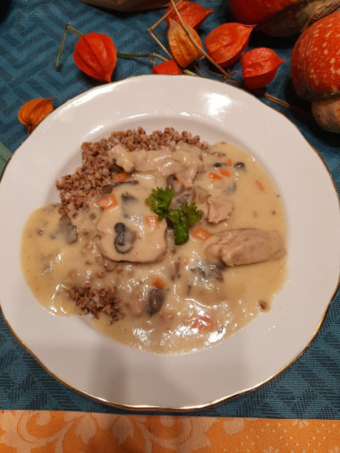Мягкая свиная вырезка , нежная текстура сливочного соуса с изысканным вкусом и ароматом домашнего вина , вкрапления шампиньонов и овощных кусочков делают это блюдо просто невероятным ! От добавки удержаться невозможно !