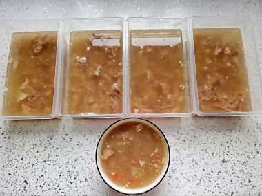 Побоялась, что не застынет, добавила желатина. Хотя пальцы и так слипались от бульона, и так бы застыло.
