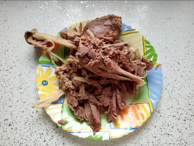 Сваренное мясо разберите, отделяя и убирая косточки. Затем готовое мясо можно разобрать на волокна, можно крупно или мелко порезать, как больше нравится.