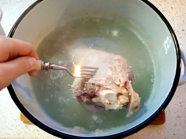Для варки холодца лучше выбрать плоскую кастрюлю с широким утолщённым дном. Если у вас бедро индейки на кости, то кость следует вырезать. Промытые части индейки сложите в кастрюлю, залейте холодной водой так, чтобы она прикрывала всё мясо. Поставьте кастрюлю на огонь, доведите до кипения, снимите накипь. Далее уменьшите нагрев и варите мясо на среднем огне около двух часов, периодически снимая накипь и жир.