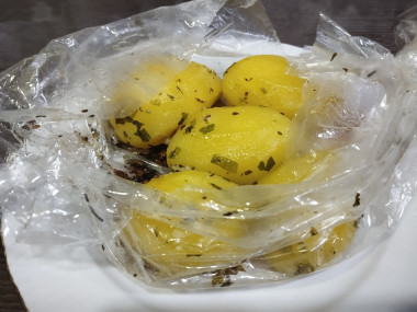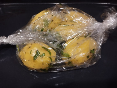 Выложите картофель с заправкой в рукав для запекания, завяжите концы или закрепите клипсами. Ещё раз перемешайте картофель внутри пакета. Положите пакет на противень или форму для запекания. Проткните рукав зубочисткой в нескольких местах для выхода пара. Поставьте картофель в форме в духовку примерно на 40 минут. Точное время зависит от вашей духовки. Подробнее об этом читайте по ссылке в конце рецепта. Готовность проверьте зубочисткой или шпажкой.