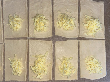 В на одну половину каждого прямоугольника выкладываем две чайные ложки тертого сыра. Закрываем начинку второй половинкой теста и слегка придавливаем, чтобы они соединились и конвертики не развалились в процессе выпечки. Можно украсить край конвертиков, надавливая на него вилкой.