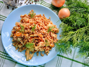 Затем добавьте в сковороду готовую гречневую кашу. Всё перемешайте и хорошо прогрейте. Разложите по тарелкам готовую гречневую кашу с тушенкой и подавайте к столу. Приятного аппетита!