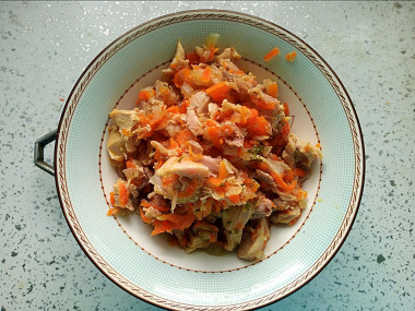 В сковороде разогрейте немного растительного масла. О том, как подобрать идеальную сковороду, а также как правильно выбрать растительное масло, читайте в отдельных статьях, ссылки в конце рецепта. Обжарьте измельченные лук и морковь в течении 1-2 минут. Откройте банку тушенки и добавьте её содержимое в сковороду. Все хорошо перемешайте и прожарьте, чтобы жир из тушенки растопился.