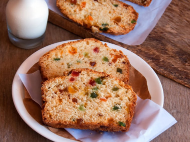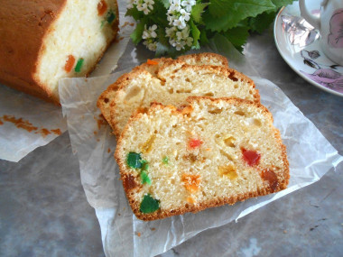 Пирог очень мягкий, воздушный и сладкий. Нежный сливочный вкус в сочетании с яркими цукатами превосходит мои ожидания! Рекомендую!