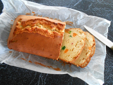 Цукаты покупала мелкие, не нарезала, просто обваляла в муке. Готовила пирог в прямоугольной форме для кекса размером 23 на 13 см, выстелив пергаментом. Пирог получился большой и выпекала я его сначала 50 минут при 180 С, затем проверяла готовность зубочисткой каждые 5 минут. В итоге на выпечку в духовке ушло 75 минут. Аромат стоят превосходный!
