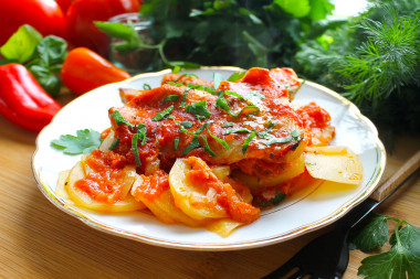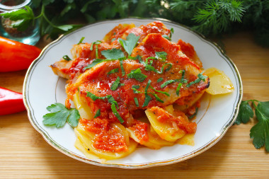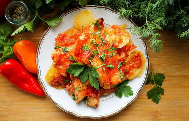 Картофель у меня твёрдых сортов и за 30 минут не успевает приготовиться, а поэтому я картофель, лук и морковку полила частью томатного соуса и отправила в духовку на 20 минут. Затем выложила рыбу, полила остатками соуса и запекала ещё 30 минут. Так как в моей духовке чеснок и зелень начинает "гореть", то использовала я чесночный порошок, а петрушку посыпала уже в самом конце.