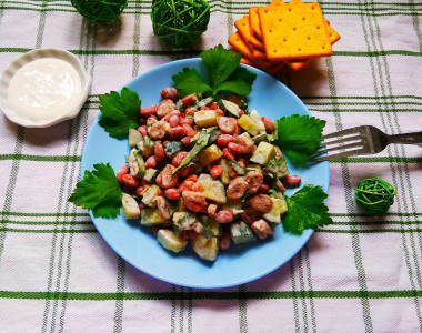 Салат можно сделать и без огурцов, только сухарики и фасоль. Но со свежим огурцом салат получится более свежим. Салаты с фасолью получаются достаточно сытными. Но также можно добавить еще и вареные яйца или вареную колбасу.
