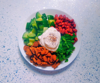 Этот рецепт меня очень выручил. Нужно было срочно приготовить салат к приходу гостей. Хорошо, что в запасе была фасоль и сухарики) Фасоль промыла кипяченой водой и дала ей обсохнуть. Сухарики у меня были со вкусом копченой колбасы. Кстати, с помощью сухариков можно регулировать вкус салата! Мне кажется сюда хорошо подойдет вкус сыра, бекона или холодца с горчицей. Огурчик был свеженький, огород еще плодоносит) Из зелени взяла листья сельдерея, они имеют пряный аромат и кисленький вкус. Еще немного приправила свежемолотым перцем. Все продукты отлично дополняют друг друга. А сметана все это связала вместе. Мне кажется, майонез бы не подошел к этому салату. Вкусов и так достаточно. Нам всем очень понравился салат, смели сразу же, надо было двойную порцию делать) Спасибо за рецепт!