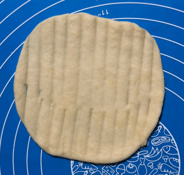 Как красиво завернуть булочки с начинкой? Каждый шарик раскатайте на присыпанном мукой столе в круг Ø 12-13 см. Длинной шпажкой или палочкой для суши на одной половине сделайте параллельные углубления.Шаг 13: