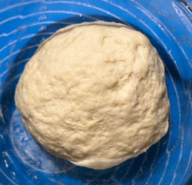 Тесто скатайте в шар, выложите в смазанную растительным маслом миску, накройте пищевой пленкой и оставьте в тепле на 1 час. Я ставлю в слегка теплую (выключенную) духовку. В ней тесто поднимается очень хорошо.Шаг 6: