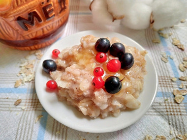Меня папа попросил сварить ему кашу без молока, он на диете и не употребляет в пищу молочные продукты. На сайте нашла рецепт овсяной каши с мёдом на воде. У меня были овсяные хлопья с добавлением пшеничных и гречневых. Кашу варила по пропорциям, указанным в рецепте. Хлопья засыпала в кипящую воду, посолила и проварила примерно три минуты. Сливочное масло не добавляла, заменила на ложку растительного. После остывания каша загустела, если нужна более жидкая консистенция, то понадобится больше воды. При подаче добавила сверху мёд и ягоды. Каша вкусная даже без молока, мёд хорошо ароматизирует!