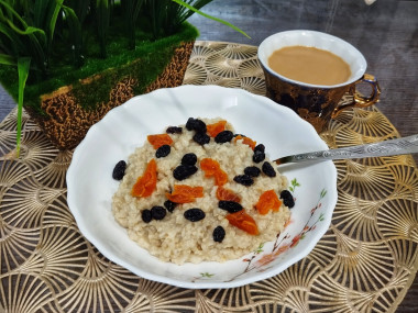 Хочется разнообразить обычную овсяную кашу и в результате поиска нашла рецепт: Овсяная каша с медом на воде. Решила приготовить на завтрак. В качестве добавок брала изюм и курагу,которые залила кипятком,пока варилась каша. В готовую кашу добавила сливочное масло и мед, перемешала и накрыла крышкой.