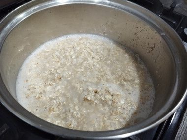 Варите кашу, помешивая, по времени, указанном на упаковке от хлопьев. Если каша сильно загустеет, то можете добавить в нее еще воды (лучше кипятка). Мои быстрые хлопья варились около трех минут. Если вы любите более сливочный вкус у каши, то можете за минуту до окончания варки влить в кашу молоко (но тогда уменьшите воду на количество молока, которое хотите добавить).