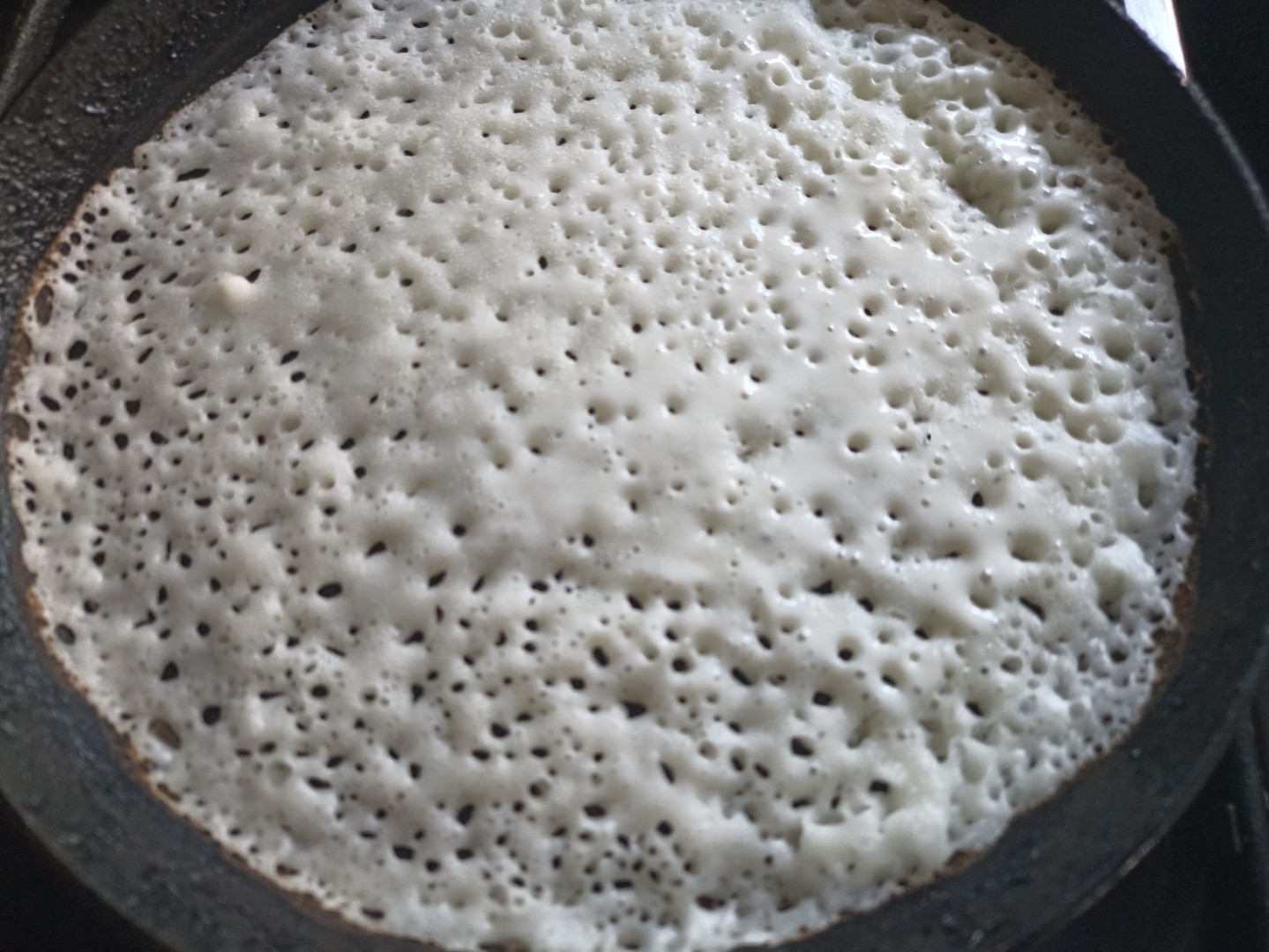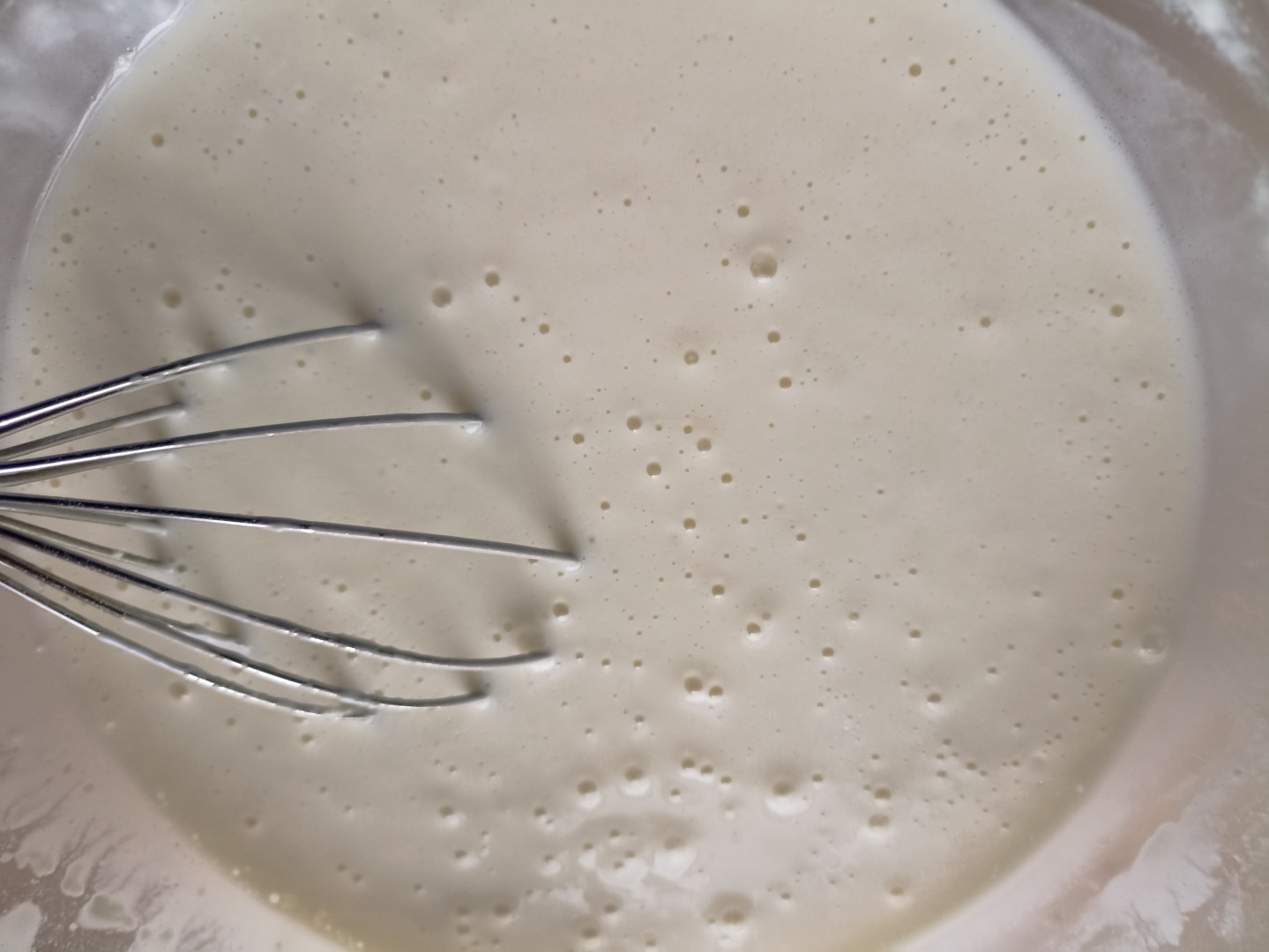 Тесто для таких блинов готовится достаточно необычно, по крайней мере для меня. Ни разу я не заваривала блинное тесто кипятком. По консистенции тесто получается достаточно жидкое, на его поверхности во время отстаивания образуется много пузырьков.