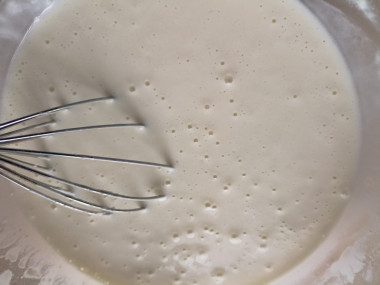 Влейте в тесто растительное масло и перемешайте. Оставьте тесто постоять на 15-20 минут, снова перемешайте и можно начинать жарить блины. Это очень важный этап в приготовлении блинного теста без яиц, не пропускайте его. За это время мука отдаст свою клейкость тесту, все ингредиенты действительно качественно смешаются, и блины при жарке не будут прилипать к сковороде и рваться.Шаг 5: