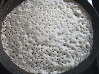 К выпеканию блинов мне пришлось приспосабливаться. К сковороде, на которой я обычно пеку блины, первый блин прилип, и нормально перевернуть мне его не удалось. Для последующих блинов я взяла чугунную сковороду. Запоров ещё два блина, я наконец-то выставила огонь нужной мощности, и блины начали выпекаться как по маслу – легко и просто. Перед выпеканием каждого блина я смазывала сковороду растительным маслом. Чугунная сковорода очень тяжелая, и распределять блинное тесто, одной рукой наливая тесто, а другой наклоняя сковороду по кругу, может только мой муж (мне и двумя руками это не просто сделать). Так что я формировала блины, распределяя тесто по кругу с помощью округлой стороны половника.