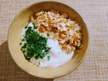 Добавляем сушеный лук к сметане, затем всыпаем луковый и чесночный порошок. Перемешиваем сухую часть со сметаной до однородности.