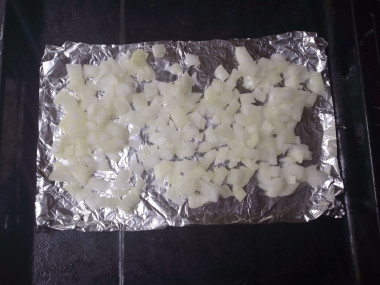 Сушеного лука у меня не было, поэтому решила воспользоваться рекомендацией из рецепта и приготовила его сама. Порезала крупную луковицу кубиками и сушила в духовке на самом маленьком огне с открытой дверцей. Половину сухого лука измельчила в порошок, а вторую половину оставила как есть.