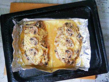 Готовила из постной свинины. Отбила куски мяса и приправила нарезанным чесноком и сушеным базиликом. На мясо выложила обжаренные шампиньоны и лук. Сверху закрыла натертым сыром. Запекала 50 минут в духовке, соорудив из фольги форму с бортиками и закрыв ее сверху тоже фольгой. Затем сняла фольгу и запекала еще 10 минут. Время готовки увеличила из-за особенностей моей духовки. Получилось изумительно! Мясо хорошо пропеклось, стало мягким и вкусным. Сочетание мяса, грибов и сыра - отличное!