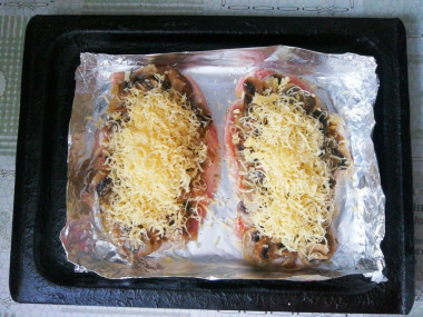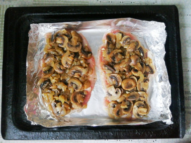 На лук уложите пластинки шампиньонов. При желании можете грибы и лук использовать не в свежем, а жареном виде. Нужно нарезать их небольшими кусочками и обжарить на растительном масле до выпаривания лишней влаги и легкого золотистого цвета. И эту массу распределить по отбивным.