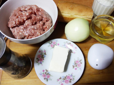 Калорийность продуктов: Фарш мясной, Батон, Молоко, Лук репчатый, Сливочное масло, Соль, Перец черный молотый, Растительное масло, Пшеничная мука