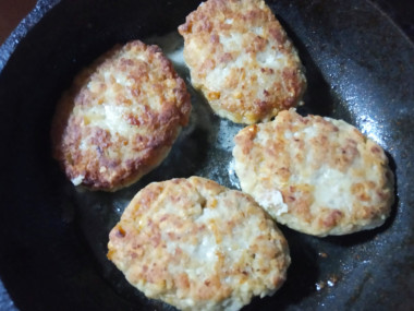 На сковороду налейте растительное масло. Разогрейте его. Выложите на разогретое масло котлеты. Обжаривайте их на среднем огне с обеих сторон до образования румяной корочки.