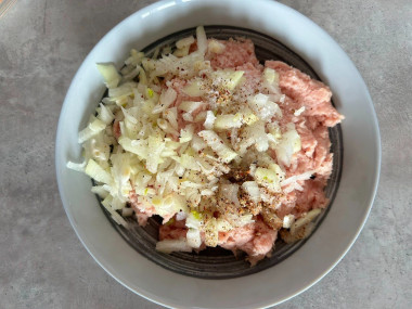 В миску с хлебом положите приготовленный фарш, добавьте мелко порезанный или натертый на терке репчатый лук, специи по вкусу: соль и черный молотый перец и натертое на мелкой терке подмороженное в морозильной камере сливочное масло.