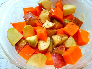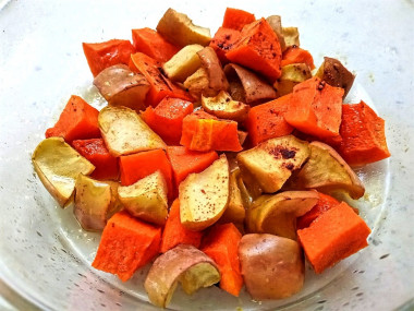 Возьмите огнеупорную форму или специальную посуду для микроволновой печи, смажьте дно сливочным маслом, он не позволит прилипнуть кусочкам фруктов и овощей к посуде, а кроме того лакомство приобретет приятный сливочный вкус. В посуду выложите приготовленные кусочки тыквы и яблока, чередуя их между собой.