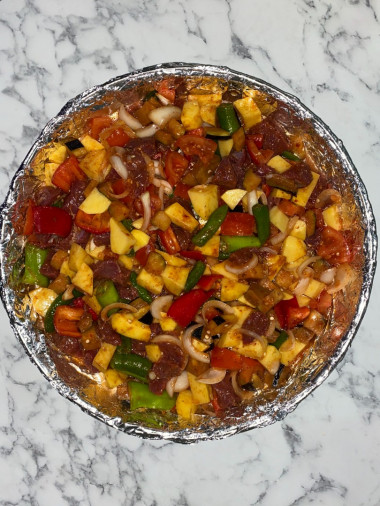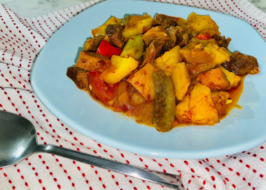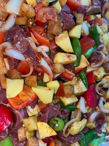 Для восполнения жидкости я использовала воду, блюдо получилось с насыщенным бульоном от самой говядины и овощей, я добавила к картофелю и моркови ещё баклажаны и перец, чтобы соус был ярче и питательней.