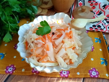 На четвертый день я убрала капусту в холодильник дня на три. А потом мы угощались очень вкусной капустой, она хрустящая, с приятной кислинкой, в меру соленая. А рассол какой вкусный и питательный! Винегрет с этой капустой тоже отменный получился!