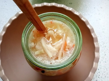 Поставьте банку с капустой в миску или тарелку и оставьте в комнате, прикрыв крышкой, не закручивая. Можно просто положить крышку сверху. Необходимо будет время от времени протыкать капусту деревянной шпажкой, чтобы выходил образующийся при брожении воздух. Я держала капусту на подоконнике на кухне 4 дня. Выливающийся рассол нужно снова возвращать в банку.