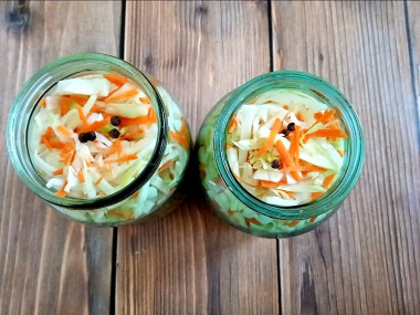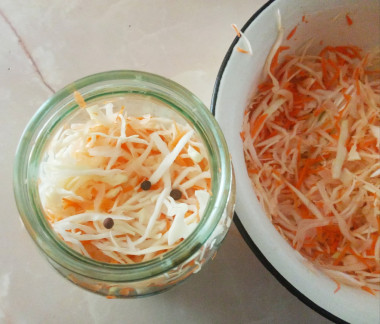 Из 1 кг. капусты и 1 средней морковки у меня вышло ровно две литровые банки. Капусту резала от руки, а морковь натерла на крупной тёрке. Уложила все в банки, пересыпая горошком черного перца.