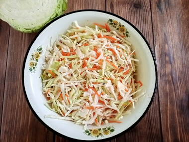 Капусту перемешайте, но не мните, чтобы она не выделила сок, в этом случае это совсем не нужно. Просто перемешайте лопаткой, чтобы морковь распределилась равномерно по всему объему капусты.