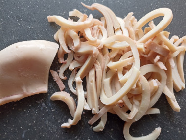 В сотейник налейте воду, добавьте соль. Поставьте сотейник на огонь и доведите воду до кипения. Положите тушку кальмара в кипящую воду и проварите его 1,5-2 минуты, дольше варить не следует, иначе он станет жёстким. Откиньте кальмар на дуршлаг и промойте под холодной проточной водой, очищая от внутренностей и шкурки. Охлаждённый и очищенный кальмар нарежьте не очень толстыми кольцами и выложите в салатник.